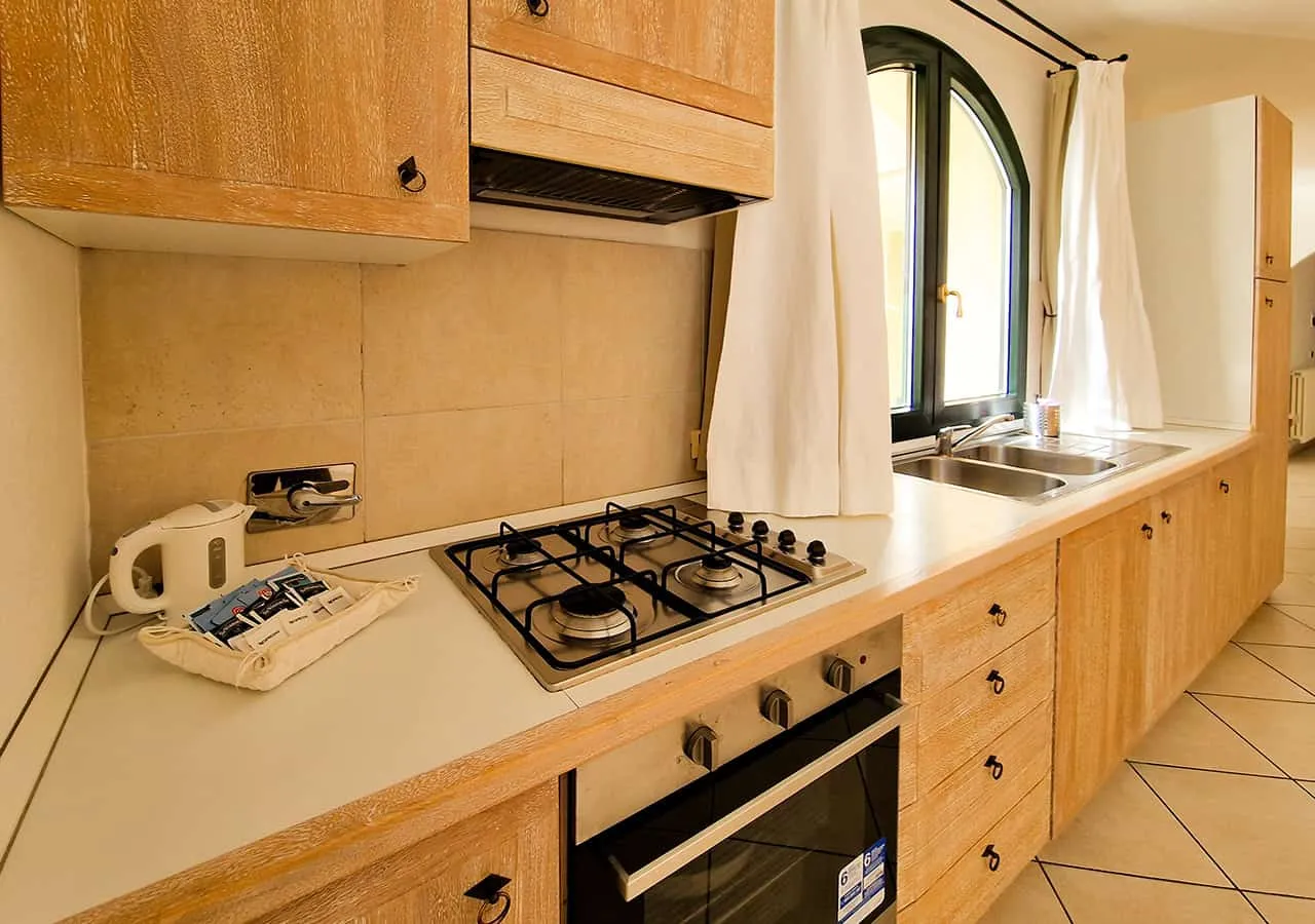 Cucina con pentole, stoviglie, forno, forno a microonde, bollitore e tutto il necessario per preparare pasti in autonomia.